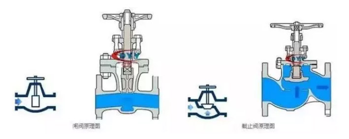 截止閥是低進(jìn)高出,從外觀看有明顯的管道不在一相水平線上。閘閥流道在一個(gè)水平線上。閘閥的行程比截止閥的要大。