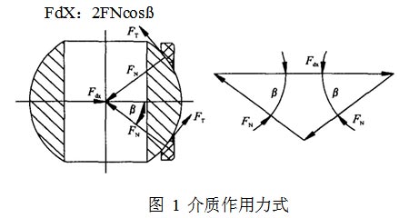 由于閥座和殼體不是粘接密封而是壓縮密封,因此出口端閥座軸向總密封力FMZ應(yīng)由閥座軸向動(dòng)密封力FdX和靜密封力FJX合成。文獻(xiàn)[ 1 ]推薦FMZ :FNC0,其值得推敲,F(xiàn)N是FMZ分力,應(yīng)小于FMZ,其次未納人靜密封力,不適合壓縮密封的靜密封結(jié)構(gòu)。由此計(jì)算的啟閉力矩也與測(cè)量值不符。忽略空心球重力影響,F(xiàn)dX在動(dòng)密封面上分解為法向力FN和摩擦力FT。其中FT為較小量,省略不計(jì),則FdX分解為一對(duì)法向力(圖1),顯然